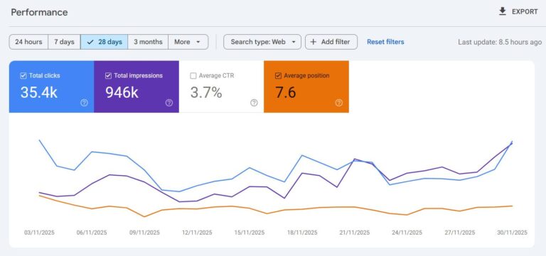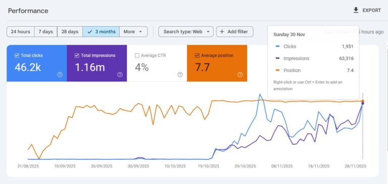 The transformation was dramatic. Starting from zero organic traffic, we generated over 46,000 clicks and 1.2 million impressions in just three months. They went from invisible in Google to competing on the first page with established brands.